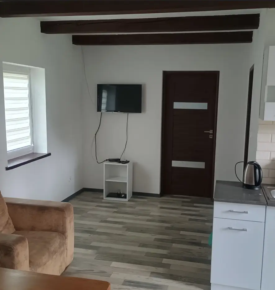 Mini apartament to doskonała opcja dla osób, które chcą wypocząć na Mazurach bez wynajmowania całego domku. Oferuje aneks kuchenny połączony z salonem, wygodną łazienkę oraz pokój z dwoma podwójnymi łóżkami, dzięki czemu komfortowo pomieści 2–4 osoby.